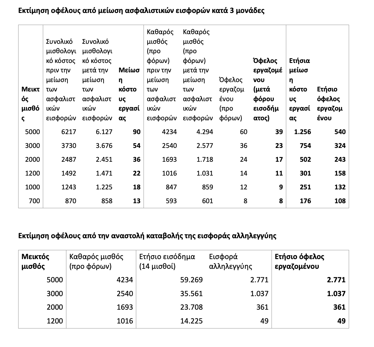 - Από την διατήρηση της μείωσης των ασφαλιστικών εισφορών κατά τρεις μονάδες, έχουν ετήσιο όφελος 251 ευρώ για κάθε εργαζόμενο που λαμβάνει μεικτό μισθό 1.000 ευρώ.