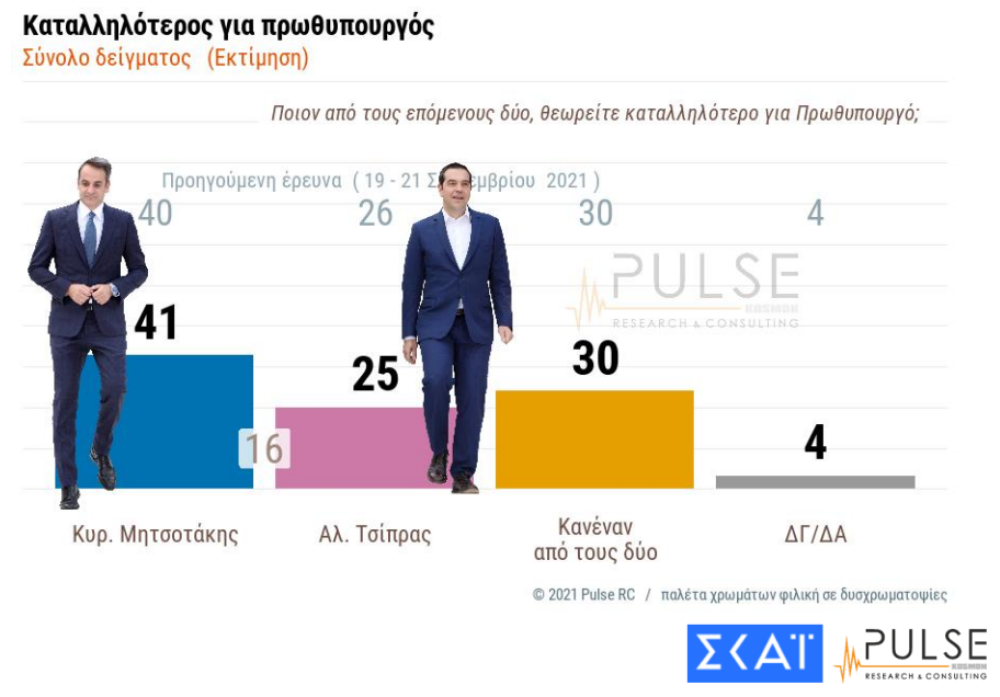 Οι ερωτηθέντες θεωρούν ως καταλληλότερο για πρωθυπουργό τον Κυριάκο Μητσοτάκη με 41% (από 40% στην προηγούμενη έρευνα), ενώ ο Αλέξης Τσίπρας συγκεντρώνει το 25% (26% στην προηγούμενη έρευνα). Κανέναν από τους δύο λέει το 30%.