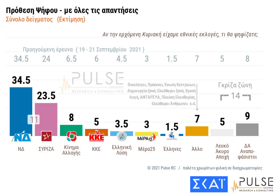 Στην πρόθεση ψήφου (με όλες τις απαντήσεις) η διαφορά είναι στις 11 ποσοστιαίες μονάδες, με τη ΝΔ να συγκεντρώνει το 34,5%, τον ΣΥΡΙΖΑ το 23,5%, το Κίνημα Αλλαγής 8%, το ΚΚΕ 5%, την Ελληνική Λύση 3,5% και το ΜέΡΑ25 3%.