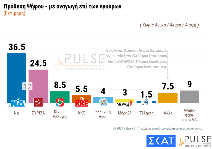 Δημοσκόπηση Pulse: Στις 12 ποσοστιαίες μονάδες η διαφορά ΝΔ - ΣΥΡΙΖΑ