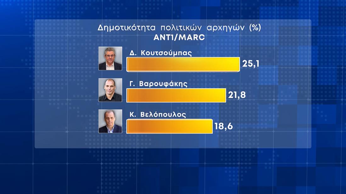 Αναφορικά με την δημοτικότητα των πολιτικών αρχηγών ο Κυριάκος Μητσοτάκης προηγείται με 50,1%, ακολουθεί ο Αλέξης Τσίπρας με 35,5% και ο Νίκος Ανδρουλάκης με 35%. Ο Δημήτρης Κουτσούμπας βρίσκεται πιο κάτω με 25,1%, ακολουθεί ο Γιάνης Βαρουφάκης με 21,8% και τελευταίος είναι ο Κυριάκος Βελόπουλος με 18,6%.
