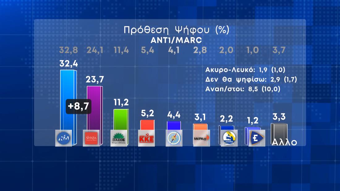 Στις 8,7 μονάδες βρίσκεται η "ψαλίδα" μεταξύ Νέας Δημοκρατίας και ΣΥΡΙΖΑ στην πρόθεση ψήφου σε δημοσκόπηση της MARC για τον ΑΝΤ1 που παρουσιάστηκε σήμερα, με το κομμα της κυβέρνησης να λαμβάνει το 32,4 % των ερωτηθέντων και ο ΣΥΡΙΖΑ 23,7%.