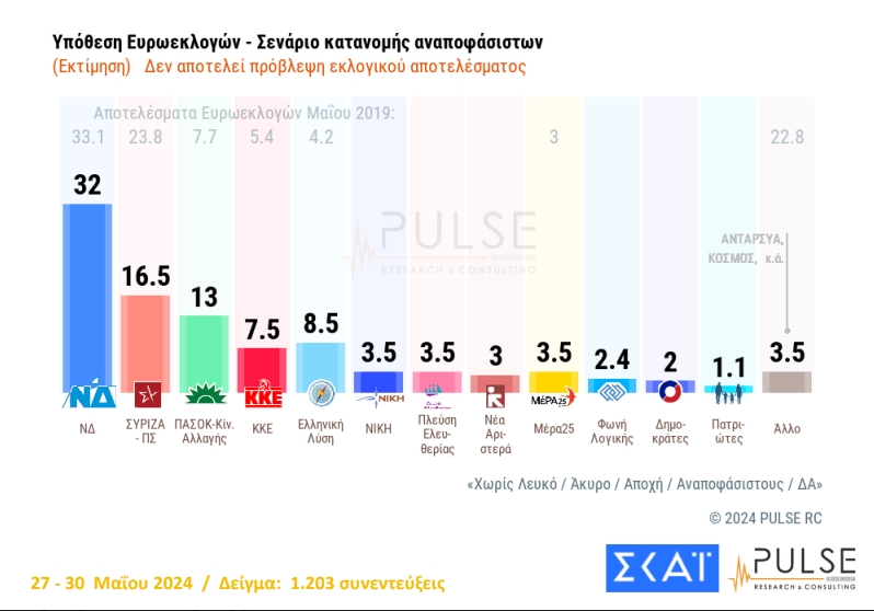 "Αέρα" 15,5 μονάδων έναντι του δεύτερου ΣΥΡΙΖΑ δίνει η δημοσκόπηση της Pulse για τον τηλεοπτικό σταθμό ΣΚΑΪ στη Νέα Δημοκρατία, 10 ημέρες πριν τη διεξαγωγή των ευρωεκλογών, την Κυριακή 9 Ιουνίου.