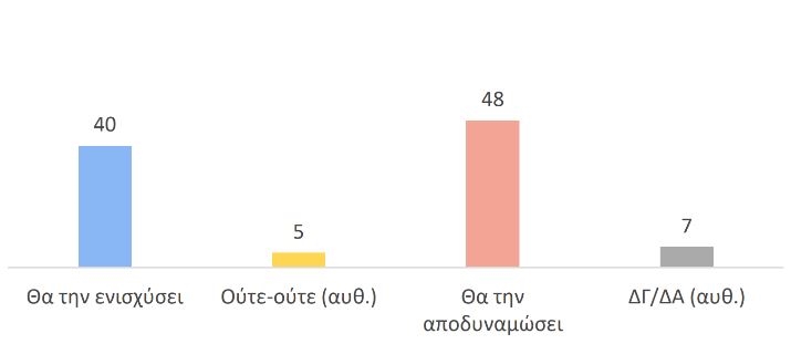 Ταυτόχρονα, η σχετική πλειοψηφία (48%) εκτιμά ότι το αποτέλεσμα των Ευρωεκλογών θα αποδυναμώσει την ΕΕ στο άμεσο μέλλον παρά ότι θα την ενισχύσει (40%).