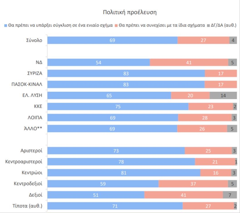 Ποια θα μπορούσε να είναι η διέξοδος από αυτόν τον φαύλο κύκλο; Η έρευνα μας δείχνει το πώς και με ποιους. Το μεγάλο στοίχημα της εποχής είναι να ξανακερδηθούν οι νέοι και οι παραγωγικές ηλικίες, με όχημα, όμως, τα θέματα που καίνε τη ζωή τους. Άρα η απάντηση δεν μπορεί να είναι μια γραμμική συνάρθρωση δυνάμεων, με βάση τους παραδοσιακούς πολιτικούς διαχωρισμούς. Αυτήν ακριβώς τη λογική έχουν απορρίψει οι πολίτες ξανά και ξανά στις κάλπες.