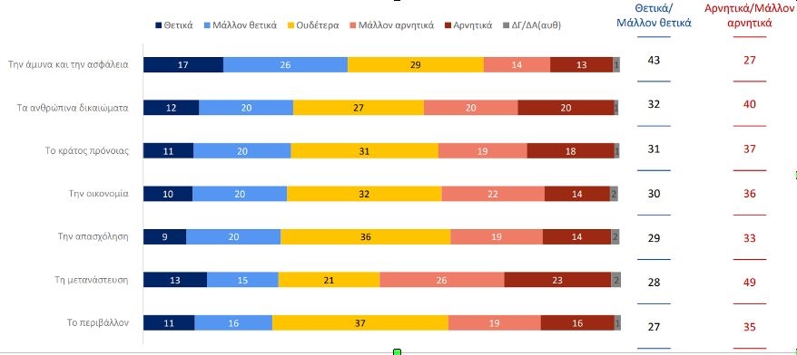 Αντίθετα, σε όλα τα υπόλοιπα πεδία πολιτικής αναμένεται αρνητική επίδραση: στο κράτος πρόνοιας, στην οικονομία και στην απασχόληση, και ιδιαιτέρως στη μετανάστευση, όπου το 28% των ερωτηθέντων πιστεύει ότι θα έχει θετική ή μάλλον θετική επίδραση, σε σύγκριση με το 49% που προβλέπει αρνητική ή μάλλον αρνητική επίδραση. Αρνητική εκτίμηση υπάρχει επίσης για τα ανθρώπινα δικαιώματα και το περιβάλλον.