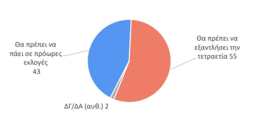 Παράλληλα, το 43% των ερωτηθέντων πιστεύει ότι ο Πρωθυπουργός θα πρέπει να προκηρύξει πρόωρες εκλογές, αντί να εξαντλήσει την τετραετία, όπως προτιμά το 55%. Το σενάριο των πρόωρων εκλογών υποστηρίζεται περισσότερο από τις νεότερες ηλικιακές ομάδες και από άτομα που τοποθετούνται πιο αριστερά στο πολιτικό φάσμα. Αντίθετα, οι ψηφοφόροι της Νέας Δημοκρατίας κατά πλειοψηφία προτιμούν την εξάντληση της τετραετίας.