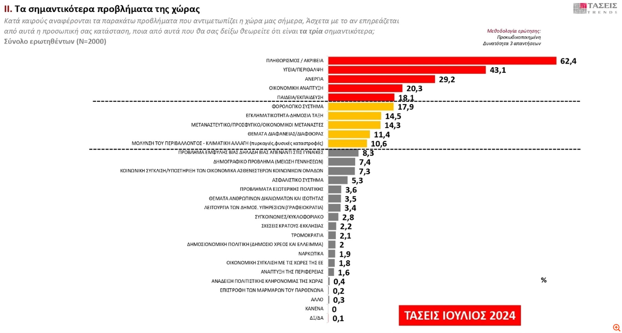 Οι πολίτες θεωρούν ότι τα τρία σημαντικότερα προβλήματα της χώρας είναι: πληθωρισμός/ακρίβεια με 62,4 %, υγεία/περίθαλψη με 43,1 % και ανεργία με 29,2%.