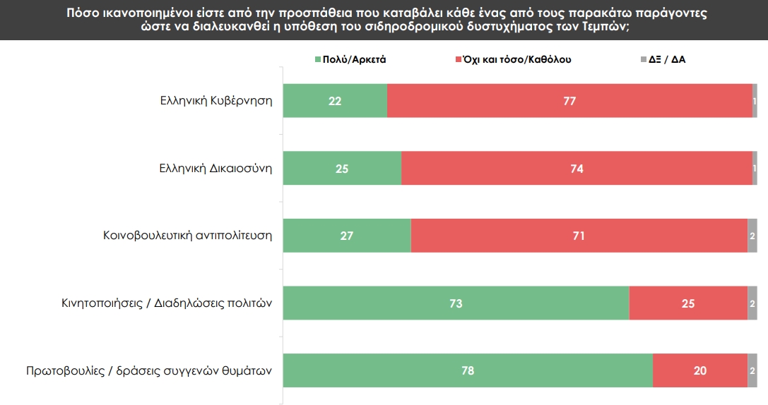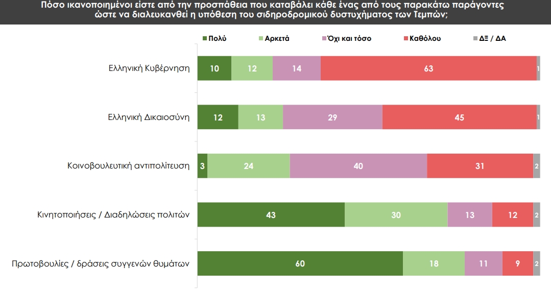 Η κοινοβουλευτική αντιπολίτευση επίσης εμφανίζει εξαιρετικά χαμηλά ποσοστά ικανοποίησης (27%), ενώ αντίθετα πολύ υψηλή ικανοποίηση ανιχνεύεται σε σχέση με τις κινητοποιήσεις και τις διαδηλώσεις πολιτών (73%). Τέλος, η κατηγορία που συγκεντρώνει τη μεγαλύτερη αποδοχή από την κοινή γνώμη αφορά τις πρωτοβουλίες και τις δράσεις των συγγενών των θυμάτων, με το 78% να δηλώνει ικανοποιημένο από αυτές και μόλις το 20% να της αξιολογεί ως μη ικανοποιητικές.