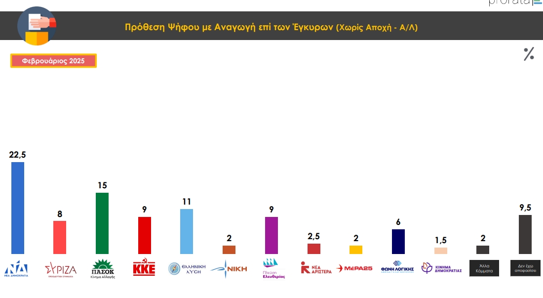 Καταληκτικά, συγκρίνοντας τα αποτελέσματα της έρευνας με την προηγούμενη μέτρηση του Δεκεμβρίου 2024, αποτυπώνεται μια πτώση της τάξης του 3% για τη Νέα Δημοκρατία, η οποία στη προηγούμενη μέτρηση είχε καταγράψει 25,5%. Την ίδια στιγμή, ο ΣΥΡΙΖΑ σημειώνει οριακή αύξηση δυνάμεων κατά 1%, ενώ το ΠΑΣΟΚ μείωση αντίστοιχου μεγέθους. Το ΚΚΕ αυξάνει την εκλογική επιρροή του από 8% σε 9%, ενώ η Ελληνική Λύση διευρύνει την επιρροή της κατά 3%, φθάνοντας στο 11%. Παράλληλα, η Φωνή Λογικής καταγράφει άνοδο 2%, φτάνοντας το 6%, ενώ την εντυπωσιακότερη αύξηση δυνάμεων καταγράφει η Πλεύση Ελευθερίας, η οποία διπλασιάζει την επιρροή της από 4,5% σε 9%, σύμφωνα με τα ευρήματα του Πολιτικού Βαρόμετρου του Φεβρουαρίου. Τέλος, πτωτική τάση καταγράφεται για το κόμμα Νίκη αλλά και για το ΜεΡΑ25, ενώ οριακή αύξηση δυνάμεων αποτυπώνεται σε σχέση με τη Νέα Αριστερά, της οποίας η επιρροή αυξάνεται οριακά, από 2% σε 2,5%.