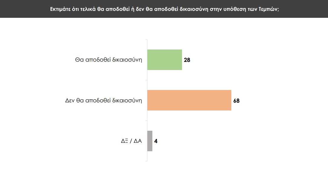 Αναφορικά με την υπόθεση του σιδηροδρομικού δυστυχήματος στα Τέμπη, η έρευνα εξετάζει την εκτίμηση των πολιτών ως προς το εάν τελικά θα αποδοθεί δικαιοσύνη. Σύμφωνα με τα αποτελέσματα, το 68% των ερωτηθέντων θεωρεί ότι δεν θα αποδοθεί δικαιοσύνη στην υπόθεση, ενώ το 28% εκτιμά το αντίθετο.
