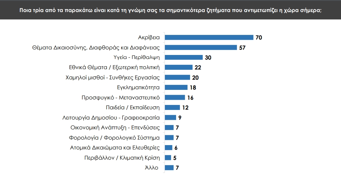 Ως το κορυφαίο ζήτημα που αντιμετωπίζει η χώρα σήμερα αξιολογούν οι πολίτες την ακρίβεια, σύμφωνα με δημοσκόπηση της Prorata, με τα θέματα δικαιοσύνης, διαφθοράς και διαφάνειας να αναδεικνύονται ως το δεύτερο σημαντικότερο ζήτημα. Για την υπόθεση των Τεμπών, σχεδόν 8 στους 10 πολίτες πιστεύουν ότι η κυβέρνηση δεν έχει διαχειριστεί σωστά το θέμα, ενώ η κοινοβουλευτική αντιπολίτευση επίσης εμφανίζει εξαιρετικά χαμηλά ποσοστά ικανοποίησης.