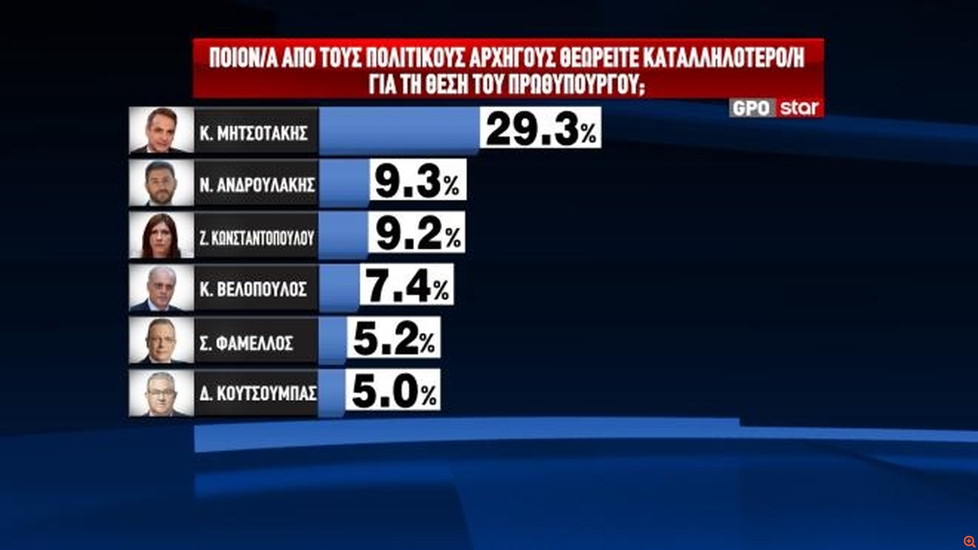Καταλληλότερος πρωθυπουργός θεωρείται ο Κυριάκος Μητσοτάκης με 29,3% και ακολουθεί ο κανένας με 25,3%. Ο Νίκος Ανδρουλάκης προηγείται της Ζωής Κωνσταντοπούλου. Συγκεντρώνει 9,3% ενώ η πρόεδρος της Πλεύσης Ελευθερίας 9,2%.