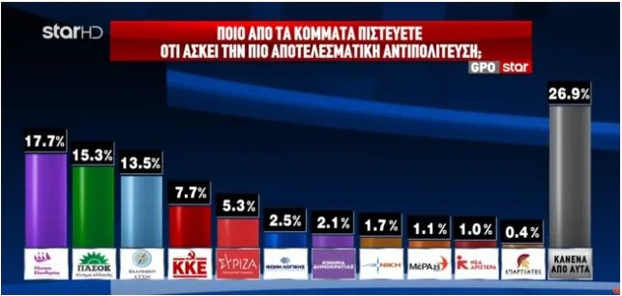 Η Πλεύση Ελευθερίας θεωρείται ότι ασκεί πιο αποτελεσματική αντιπολίτευση από το 17,7% και ακολουθούν το ΠΑΣΟΚ με 15,3%, η Ελληνική Λύση με 13,5%, το ΚΚΕ με 7,7% , ο ΣΥΡΙΖΑ με 5,3%, η Φωνή Λογικής με 2,5% , το Κίνημα Δημοκρατίας με 2,1% κλπ. Ο "Κανένας" συγκέντρωσε το μεγαλύτερο ποσοστό, στο 26,9%