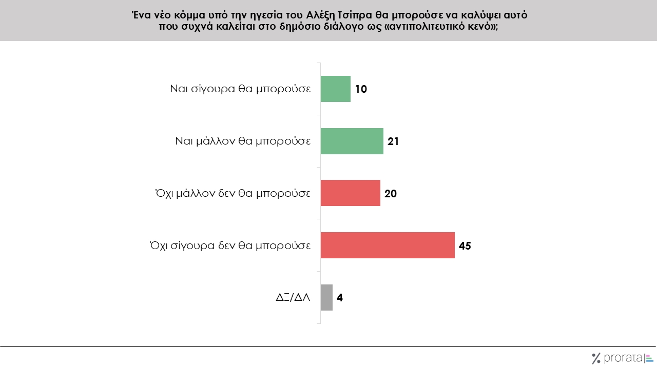 Συμπληρωματικά, η έρευνα διερεύνησε και την εκτίμηση της κοινής γνώμης σε σχέση με το αν ένα νέο κόμμα υπό την ηγεσία του Αλέξη Τσίπρα θα μπορούσε να καλύψει αυτό που συχνά καλείται στο δημόσιο διάλογο ως "αντιπολιτευτικό κενό". Ως προς αυτό, το 65% δηλώνει με υψηλή ή απόλυτη βεβαιότητα πως "όχι, δεν θα μπορούσε να καλύψει το σχετικό κενό", το 21% ότι "μάλλον θα μπορούσε", ενώ το 10% εκφράζει βεβαιότητα πως "ναι, θα μπορούσε" να το καλύψει.