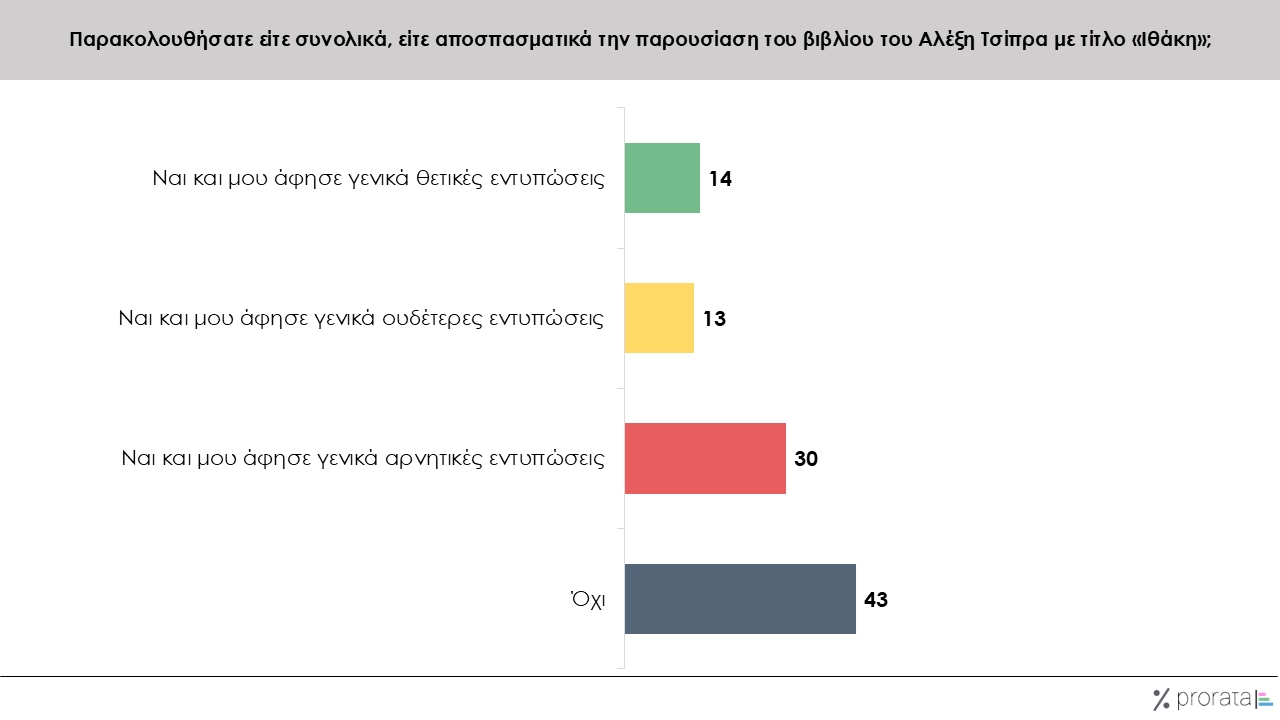 Το 57% της κοινής γνώμης παρακολούθησε είτε συνολικά, είτε αποσπασματικά την παρουσίαση του βιβλίου του Αλέξη Τσίπρα, με τίτλο "Ιθάκη", σύμφωνα με τα αποτελέσματα της  πανελλαδικής πολιτικής έρευνας που διενήργησε η εταιρεία ερευνών και δημοσκοπήσεων Prorata κατά το διάστημα 5 έως 8 Δεκεμβρίου 2025.