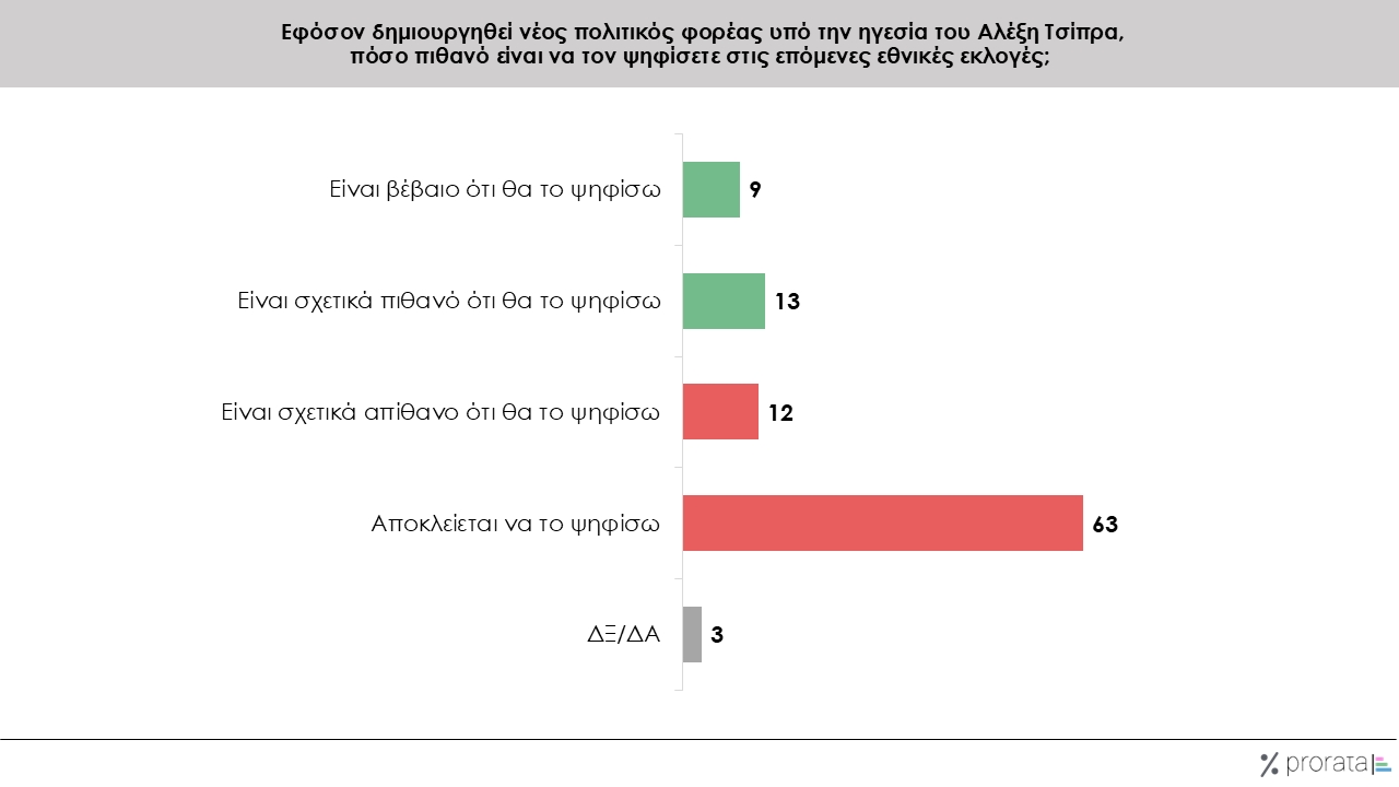 Ως προς την δεύτερη διάσταση, δηλαδή τα όρια της δυνητικής εκλογικής επιρροής ενός φορέα υπό την ηγεσία του Αλέξη Τσίπρα, το 9% δηλώνει πως είναι βέβαιο ότι θα τον ψήφιζε, το 13% ότι είναι σχετικά πιθανό να τον ψήφιζε, ενώ το 75% ότι είτε αποκλείεται, είτε ότι είναι σχετικά απίθανο να το πράξει. Τα ποιοτικά δε, τέλος, ευρήματα φανερώνουν ότι η διείσδυση του πρώην πρωθυπουργού αφορά κυρίως σε εκλογείς που στήριξαν τον ΣΥΡΙΖΑ-ΠΣ στις εκλογές του 2023 και 2024, καθώς και σε μεγαλύτερες ηλικίες, με ορισμένες ενδείξεις να οδηγούν στην διατύπωση της υπόθεσης ότι ο Αλέξης Τσίπρας θα μπορούσε να στηριχθεί και από την δεξαμενή της αποχής.