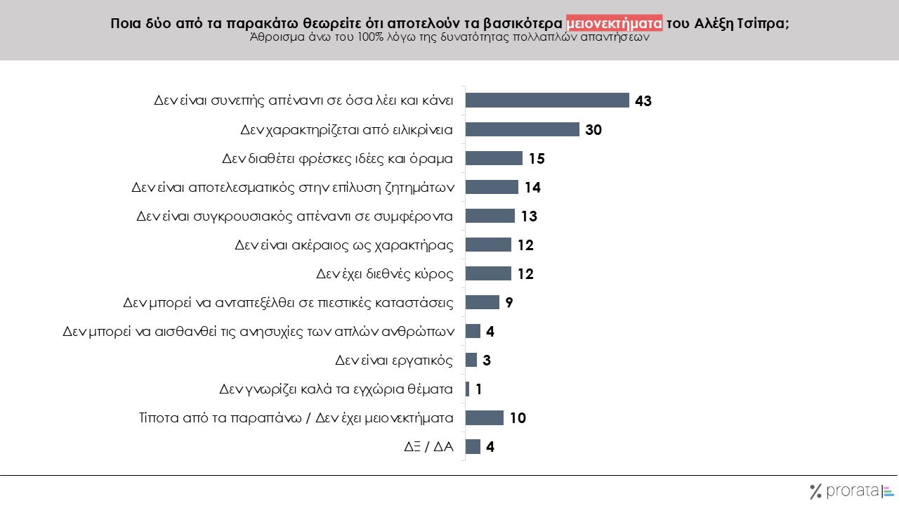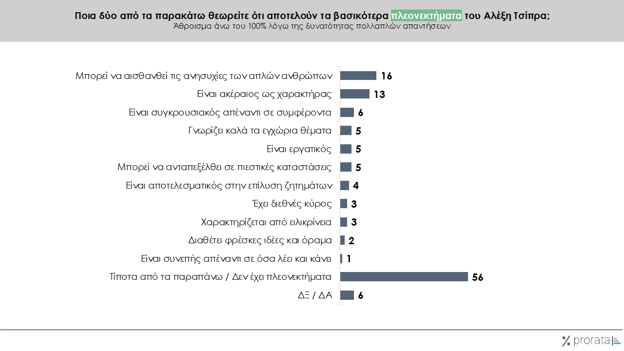 Σε άλλα εξαιρετικά ενδιαφέροντα ποιοτικά ευρήματα, ως τα μεγαλύτερα μειονεκτήματα του Αλέξη Τσίπρα γίνονται αντιληπτά η αίσθηση ασυνέπειας "ως προς τα όσα λέει και πράττει" αλλά και το γεγονός ότι "δεν χαρακτηρίζεται από ειλικρίνεια", ενώ ως μεγαλύτερα πλεονεκτήματα, πρώτον το γεγονός ότι "μπορεί να αισθανθεί τις ανησυχίες και τους προβληματισμούς των απλών ανθρώπων" και δεύτερον η αίσθηση περί "ακεραιότητας" του χαρακτήρα του. Συνολικά, τέλος, θα πρέπει να υπογραμμιστεί ότι περίπου το ήμισυ της κοινής γνώμης θεωρεί ότι ο πρώην πρωθυπουργός δεν διαθέτει κάποιο στοιχείο που τον ξεχωρίζει έναντι άλλων πολιτικών προσώπων.