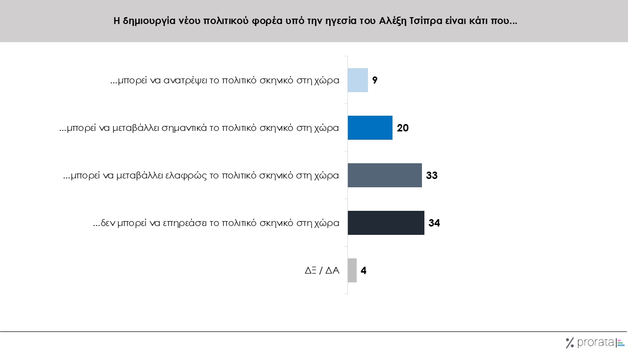 Τέλος, η έρευνα επιχείρησε να αποτυπώσει δύο ακόμα σημαντικές διαστάσεις που αφορούν την ενδεχομένη επιστροφή του Αλέξη Τσίπρα στα πολιτικά πράγματα: πρώτον την αίσθηση των πολιτών ως προς το αν μια τέτοια προοπτική φέρει - ανεξαρτήτως πιθανής ή μη στήριξης - δυναμική αλλαγής των συσχετισμών και δεύτερον ποια είναι η "περίμετρος" εκλογικής επιρροής του. Ως προς την πρώτη διάσταση, το 77% εκτιμάει πως ο πρώην πρωθυπουργός δεν θα μπορούσε να ανατρέψει - ή έστω να μεταβάλλει σημαντικά - τα πολιτικά πράγματα και το 29% ότι θα μπορούσε, είτε να ανατρέψει συνολικά το πολιτικό σκηνικό, είτε έστω να το μεταβάλλει σημαντικά.