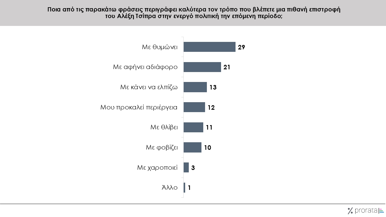 Πως όμως υποδέχονται την προοπτική επιστροφής του Αλέξη Τσίπρα στα πολιτικά πράγματα οι πολίτες; Σύμφωνα με τα ευρήματα της έρευνας, το 29% "θυμώνει" στη σκέψη εκ νέου πολιτικής ενεργοποίησης του πρώην ηγέτη του ΣΥΡΙΖΑ-ΠΣ, το 21% "αδιαφορεί", το 13% αισθάνεται "ελπίδα", το 12% "περιέργεια", το 11% "θλίψη", το 10% "φόβο", ενώ το 3% "χαρά".