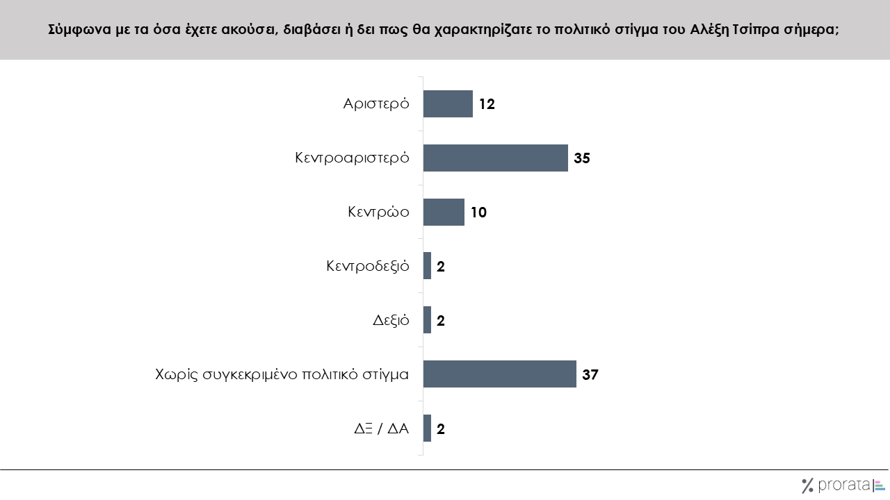 Συνολικά, η μεγαλύτερη μερίδα (30%) αποκόμισε αρνητικές εντυπώσεις από την παρουσία του πρώην πρωθυπουργού, μια μικρότερη μερίδα (14%) θετικές, ενώ το 13% ουδέτερες. Στο παραπάνω πλαίσιο, ζητήθηκε από τους ερωτώμενους να προσδιορίσουν πολιτικά το πολιτικό στίμα του Αλέξη Τσίπρα, με την μεγαλύτερη μερίδα (37%) να δηλώνει ότι δεν είναι σαφές, το 35% ότι είναι κεντροαριστερό, το 12% αριστερό και το 10% πως είναι κεντρώο, δείχνοντας ότι σημαντικά τμήματα της κοινωνίας δεν διαθέτουν προσώρας την απαραίτητη πληροφορία, ώστε να προσδιορίσουν πολιτικά το στίγμα του πρώην πρωθυπουργού.