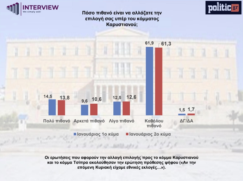 Δημοσκόπηση Interview: Στο 26,7% η ΝΔ, 2ο το ΠΑΣΟΚ - Υπεροχή Καρυστιανού έναντι Τσίπρα σε υποθετική αναμέτρηση με τον Μητσοτάκη