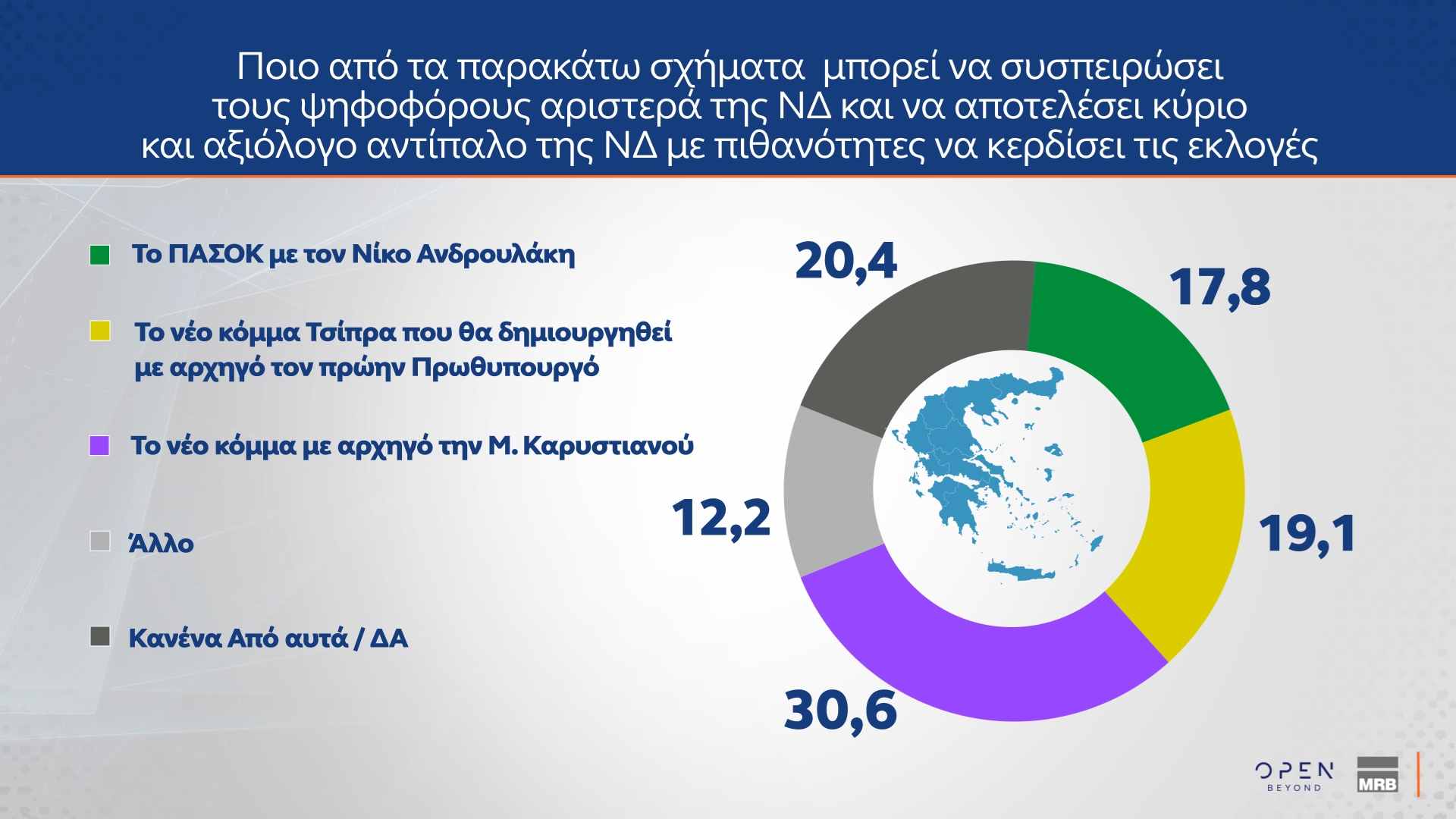 Στην ερώτηση "ποιο από τα παρακάτω κόμματα μπορεί να συσπειρώσει τους ψηφοφόρους αριστερά της ΝΔ και να αποτελέσει κύριο και αξιόλογο αντίπαλο της ΝΔ με πιθανότητες να κερδίσει τις εκλογές", το 30,6% απαντά "το νέο κόμμα με αρχηγό την Μ.Καρυστιανού", το 20,4% "Κανένα", το 19,1% "το νέο κόμμα Τσίπρα που θα δημιουργηθεί με αρχηγό τον πρώην πρωθυπουργό" και το 187,8% απαντά το "ΠΑΣΟΚ με τον Νίκο Ανδρουλάκη".
