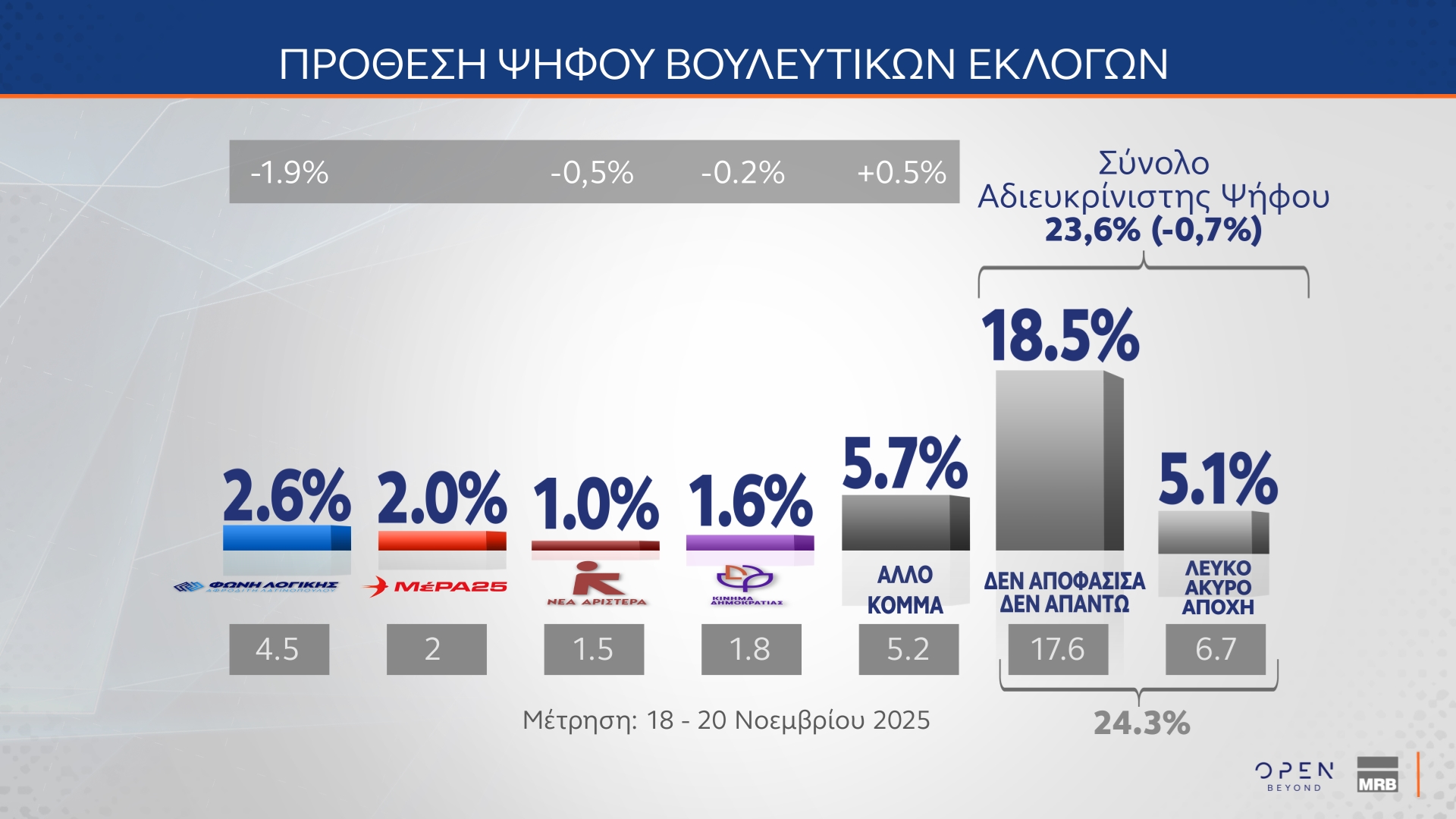 Ειδικότερα,  με βάση την εκτίμηση ψήφου (αναγωγή επί του συνόλου), η ΝΔ συγκεντρώνει 29,2%, στην πρώτη θέση. Ακολουθούν: Πλεύση Ελευθερίας 13,2%, ΠΑΣΟΚ 12,7%, Ελληνική Λύση 12,7%,  ΚΚΕ 7,9%, ΣΥΡΙΖΑ 4,6%, Φωνή Λογικής 3,4%, Νίκη 2,9%, ΜέΡΑ25 2,6%,  Κίνημα Δημοκρατίας 2,1%, Νέα Αριστερά 1,3%, Άλλο Κόμμα 7,4%.