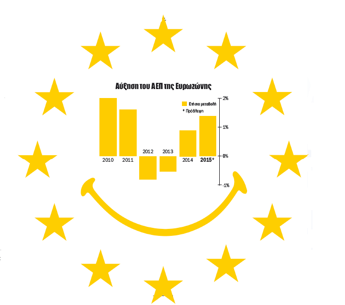 Η οικονομία των 19 αναμένεται να αναπτυχθεί με ρυθμό τουλάχιστον 1,5% φέτος, σημειώνοντας την καλύτερή της επίδοση από το 2011. Η Ευρώπη ξεπέρασε ακόμα και τις ΗΠΑ το α' τρίμηνο του 2015, με τον εκτιμώμενο ρυθμό ανάπτυξης να φτάνει το 0,4% σε σύγκριση με το προηγούμενο τρίμηνο, έναντι 0,1% των ΗΠΑ. «Η κατάσταση της οικονομίας βελτιώνεται συνολικά. Το βλέπουμε στην πράξη», λέει ο Frederic Oudea, CEO της γαλλικής τράπεζας Societe General.
