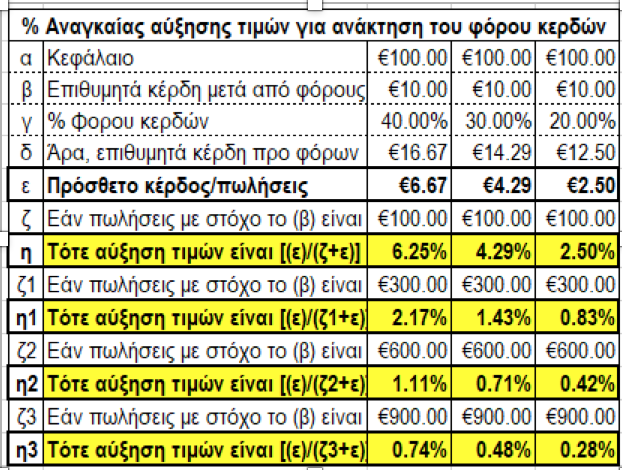 Επενδύσεις: Ο φόρος κερδών ως κίνητρο/αντικίνητρο για επενδύσεις, όπως ήδη αναφέρθηκε, κρίνεται από το κατά πόσο επηρεάζει την ανταγωνιστικότητα αυτών που θα παράγονται. Για να εκτιμηθεί πόσο σημαντική ή όχι μπορεί να είναι η επίδρασή του στις επενδυτικές αποφάσεις υπάρχουν διάφορα ποσοτικά μεγέθη στον πίνακα που παρατίθεται στο τέλος. Σημειώνεται ότι το ποσοστό αύξησης των τιμών που απαιτείται για την ανάκτηση του φόρου κερδών (και άρα το πόσο σημαντική ή όχι επίδραση μπορεί να έχει στην ανταγωνιστικότητα) εξαρτάται από δύο μεταβλητές: