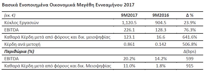 Στο εννεάμηνο του 2017 η Εταιρεία συνέχισε να καταγράφει ισχυρή άνοδο των μεγεθών της.