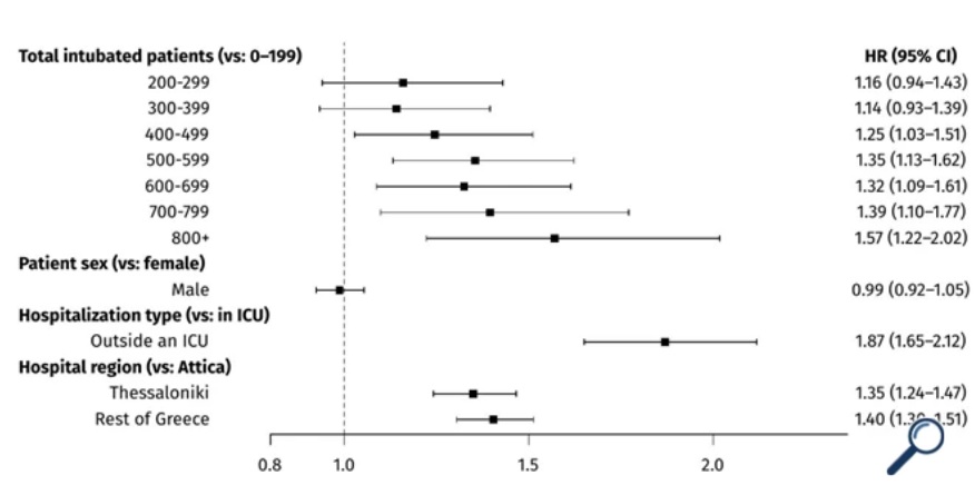 - Νοσηλεία εκτός ΜΕΘ σχετιζόταν με 87% αυξημένη θνητότητα — παρ'ότι αυτό (α) αφορούσε λίγους, μόνο ~5% των διασωληνωμένων (οι υπόλοιποι ήταν εντός ΜΕΘ), κ (β) *εν μέρει* ίσως αφορά διαλογή των πιο βαριά πασχόντων ασθενών, άρα μη αιτιακή σχέση,άρα πρέπει να ερμηνευθεί με προσοχή.