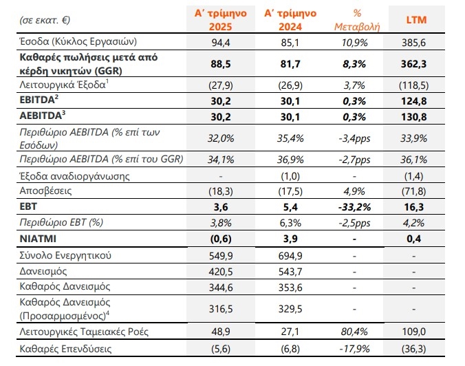 Τα κέρδη EBITDA διαμορφώθηκαν στα €30,2 εκατ. (+0,3% σε σχέση με πέρυσι), ενώ το Προσαρμοσμένο EBITDA των τελευταίων δώδεκα μηνών (LTM) ανήλθε σε €130,8 εκατ., παραμένοντας σε παρόμοια επίπεδα με το δωδεκάμηνο του 2024.