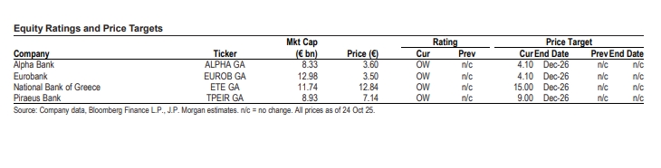 Η JP Morgan, συνολικά, δεν αναμένει σημαντικές εκπλήξεις στα αποτελέσματα γ’ τριμήνου των ελληνικών τράπεζων τα οποία μια ξεκινούν αυτή την εβδομάδα. Σε αυτό το πλαίσιο διατηρεί τη σύσταση overweight και για τις τέσσερις συστημικές, καθώς και την πριτμήση της για την Eurobank και την Εθνική Τράπεζα, ενώ υπογραμμίζει πως πι ελληνικές τράπεζες διαπραγματεύονται με P/E στο 7,6x και TBV στο 1,1x για το 2027, με μέσο όρο RoTE στο 15,2% (15,6% εξαιρουμένης της Alpha).