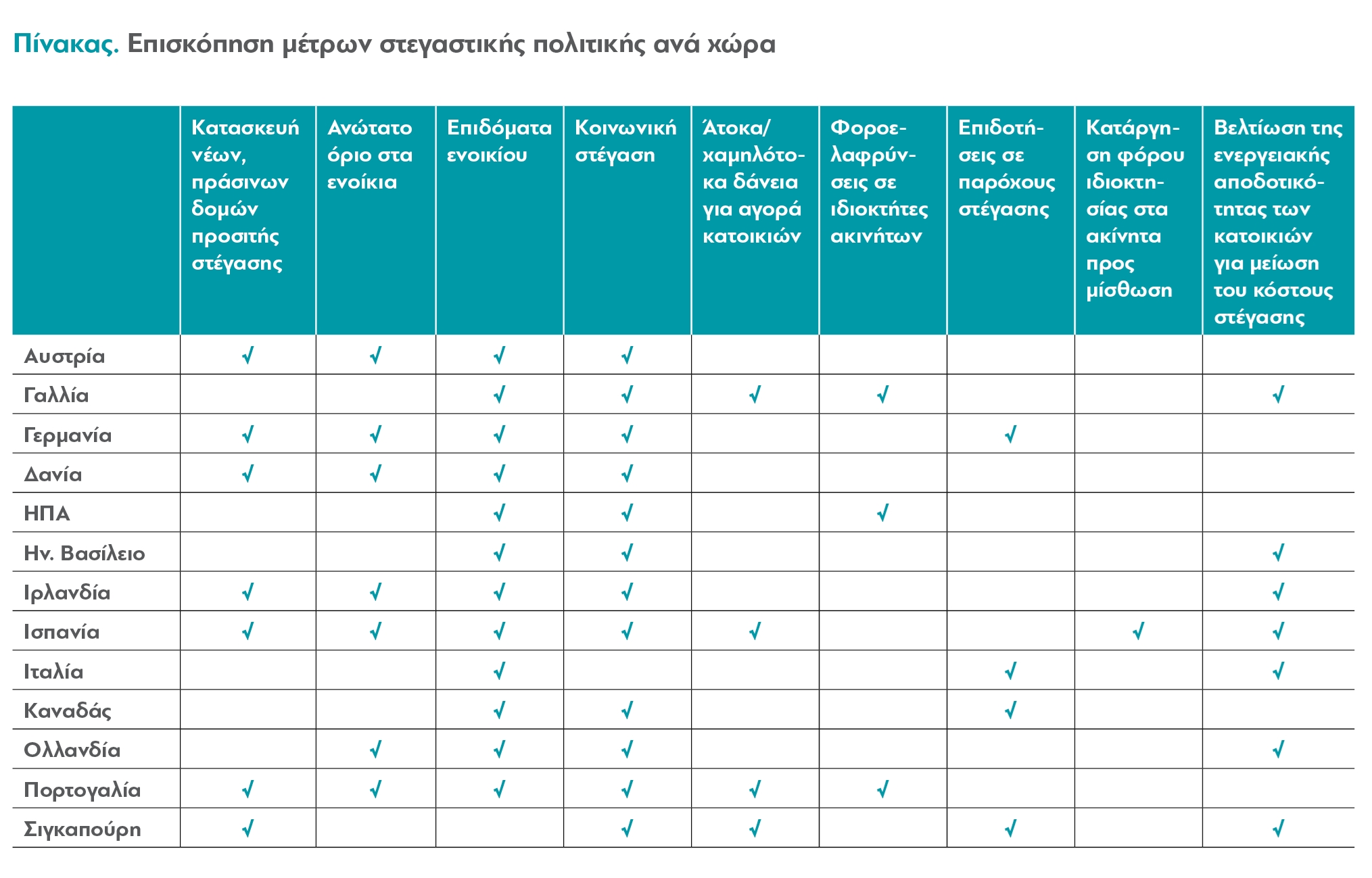 Σύμφωνα με την ανάλυση, μεταξύ άλλων, είναι δόκιμη η εξέταση μέτρων στην κατεύθυνση ενός πλαισίου ελέγχου ενοικίων, ασφαλώς με χαρακτηριστικά ευελιξίας, αλλά και στόχο αποφυγής απότομων μεταβολών, όπου υπάρχει έντονο πρόβλημα. Χαρακτηριστική είναι, επίσης, η ανομοιόμορφη κατανομή των πόρων ανάμεσα σε ιδιοκτήτες και ενοικιαστές, ενώ προκρίνεται μια πιο ισορροπημένη ενίσχυση για τους δεύτερους, καθότι αυτοί αντιμετωπίζουν το μεγαλύτερο στεγαστικό ζήτημα (Μαλούτας & Σιατίτσα, 2025). Ταυτόχρονα, υφίστανται μέτρα φοροαπαλλαγών σε περίπτωση διάθεσης κατοικιών σε χαμηλότερα ενοίκια από αυτά της αγοράς ή επιδότησης ενοικίων.