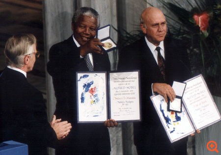 Mandela has received more than one hundred awards over four decades, most notably the Nobel Peace Prize in 1993. Ο Νέλσον Μαντέλα έχει λάβει περισσότερα από εκατό βραβεία σε διάστημα τεσσάρων δεκαετιών, με το Νόμπελ Ειρήνης το 1993, φυσικά να ξεχωρίζει, και το οποίο μοιράστηκε με τον Φρέντερικ ντε Κλερκ για τον αγώνα του ενάντια στο απαρτχάιντ.