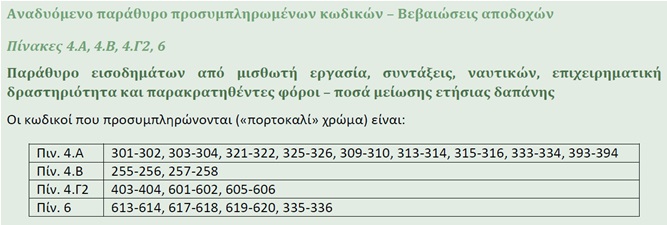 Β. Τα ποσά που καταβάλλονται στους δικαιούχους λόγω απώλειας του εισοδήματός τους και αντί του μισθού που θα κατέβαλαν οι εργοδότες τους ή τους δίδονται ως αμοιβή για παροχή εργασίας, χαρακτηρίζονται ως κανονικές αποδοχές και θα εμφανίζονται προσυμπληρωμένα στους κωδικούς 301-302 του πίνακα 4Α, για υπόχρεο-σύζυγο αντίστοιχα, αν ο φορέας έχει αποστείλει ηλεκτρονικά αρχείο βάσει της Απόφασης ΓΓΔΕ - πολ.1051/19.2.2015, ή θα συμπληρώνεται από τους υπόχρεους στους κωδικούς 343-344 του πίνακα 4Ααν δεν υπάρχει ηλεκτρονική πληροφόρηση.