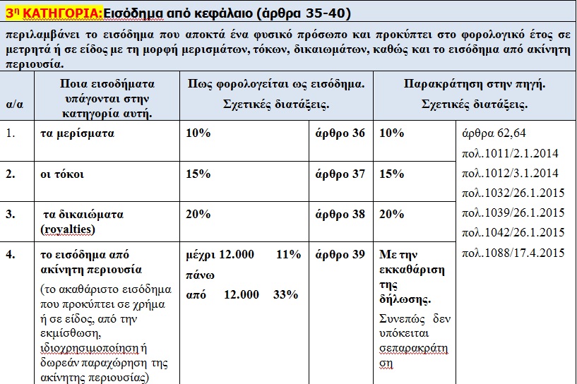 Όπως θα δούμε στους παρακάτω αναλυτικούς χρηστικούς πίνακες, κάθε κατηγορία εισοδήματος υπόκειται σε χωριστό φορολογικό συντελεστή και κατά τούτο παύει να ισχύει πλέον η έννοια του συνολικού εισοδήματος.