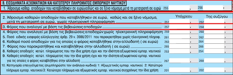 Επίσης, επισημαίνεται ότι στην περίπτωση αυτή, συμπληρώνονται συγχρόνως και οι κωδικοί αριθμοί 255-256 ή 251-252 με το άθροισμα των καθαρών αποδοχών σας, τόσο αυτών που προέρχονται από την απασχόλησή σας ως κατώτερου πληρώματος, όσο και αυτών που προέρχονται από την απασχόλησή σας ως αξιωματικός του εμπορικού ναυτικού.