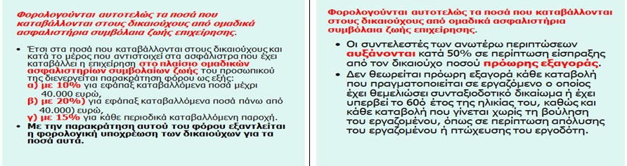 6. Το ασφάλισμα που καταβάλλεται στο πλαίσιο ομαδικών ασφαλιστηρίων συνταξιοδοτικών συμβολαίων. Αυτοτελής φορολόγηση με συντελεστές. Ο φόρος παρακρατείται και αποδίδεται με την προσωρινή δήλωση Μ.Υ. Άρθρα 15 παρ. 4, 61, 62 παρ.1ε και 64, παρ.1ε. πολ.1104/9.4.2014).