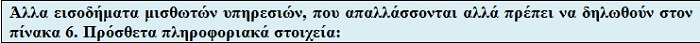Επίσης θα διαχωρίσουμε από τα εισοδήματα που καταχωρούνται στον πίνακα 4Α και συνεπώς φορολογούνται, όλα τα άλλα εισοδήματα μισθωτών υπηρεσιών, που απαλλάσσονται αλλά πρέπει να δηλωθούν στον πίνακα 6.