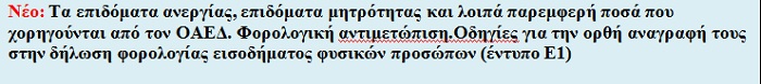 Α. Τα επιδόματα ανεργίας που καταβάλλονται στους δικαιούχους, εφόσον το άθροισμα των λοιπών εισοδημάτων του άνεργου δεν υπερβαίνει ετησίως τις δέκα χιλιάδες (10.000) ευρώ, είναι εισόδημα που απαλλάσσεται από το φόρο και δηλώνεται στους κωδικούς 661-662, για τον υπόχρεο και την σύζυγο αντίστοιχα, του έντυπου της δήλωσης φορολογίας εισοδήματος (Ε1).