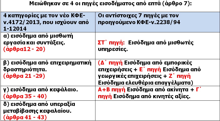 Έτσι από 1-1-2014 οι χωριστές κατηγορίες (πηγές) εισοδήματος για τα φυσικά πρόσωπα είναι πλέον οι εξής: (στον ακόλουθο συνοπτικό πίνακα, όπου δίπλα παραθέτουμε τις αντίστοιχες 7 πηγές με τον προηγούμενο ΚΦΕ-ν.2238/94).