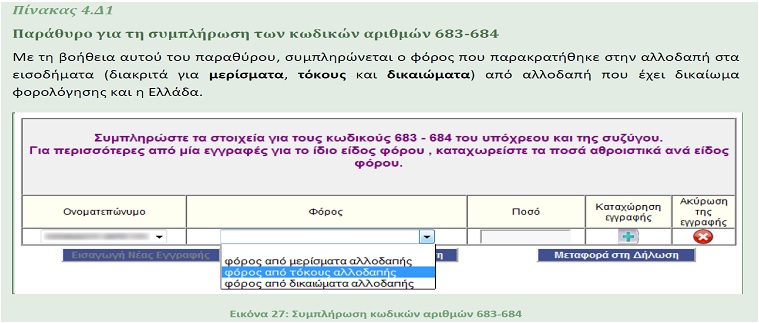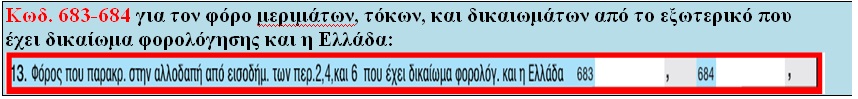Προσοχή: Κατά τη συμπλήρωση των κωδικών 683-684 ανοίγει παράθυρο (βλ. πιο κάτω σχετική εικόνα από της οδηγίες της ΓΓΔΕ - Διεύθυνση Ηλεκτρονικής Διακυβέρνησης - Δ.ΗΛΕ.Δ.) και πρέπει να συμπληρωθούν οι ενδείξεις: α) το ποσό και β) από πού προέρχεται η παρακράτηση του φόρου στο εξωτερικό, (από εισόδημα τόκων, μερισμάτων ή δικαιωμάτων), στο οποίο έχει δικαίωμα φορολόγησης και η Ελλάδα.