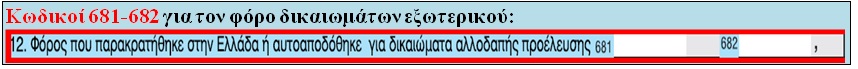Αν υπάρχουν δικαιώματα από το εξωτερικό και δεν έχει γίνει παρακράτηση ή αυτοαπόδοση του φόρου, αυτά γράφονται πιο πάνω στους κωδ. 673-674 και δεν συμπληρώνονται οι εδώ οι κωδικοί 681-682).