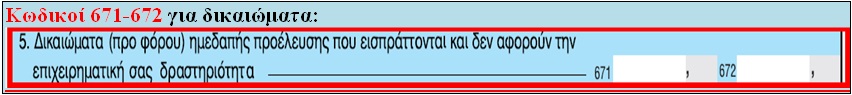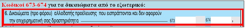 Εδώ γράφονται τα δικαιώματα προ φόρου, που προέρχονται από το εξωτερικό και φορολογούνται στην Ελλάδα και δεν αφορούν άσκηση επιχειρηματικής δραστηριότητας στο εξωτερικό.