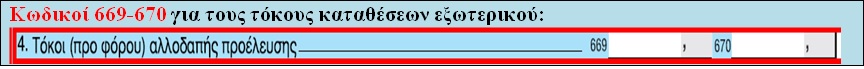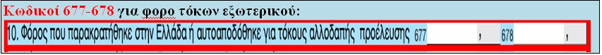 Αν υπάρχουν τόκοι από το εξωτερικό και δεν έχει γίνει παρακράτηση ή αυτοαπόδοση του φόρου, αυτοί γράφονται πιο πάνω στους κωδ. 669-670 και δεν συμπληρώνονται οι εδώ οι κωδικοί (677-678).
