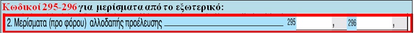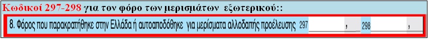 Αν υπάρχουν μερίσματα από το εξωτερικό και δεν έχει γίνει παρακράτηση ή αυτοαπόδοση του φόρου, αυτά γράφονται πιο πάνω στους κωδ. 295-296 και δεν συμπληρώνονται οι εδώ κωδικοί για τον φόρο.