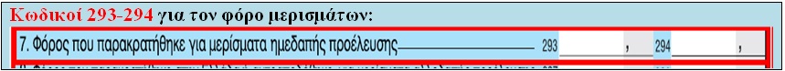 Δηλώνεται ο φόρος που έχει παρακρατηθεί από την ημεδαπή εταιρία που πραγματοποίησε την διανομή κερδών-μερισμάτων που γράφηκαν πιο πάνω στους κωδ. 291-292 και διενεργήθηκε παρακράτηση 10%.