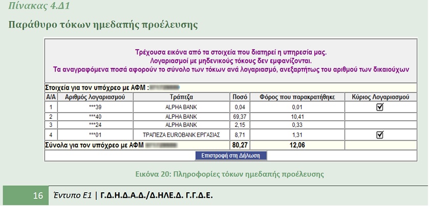 Στις περιπτώσεις που η Φορολογική Διοίκηση έχει ηλεκτρονική πληροφόρηση για αυτά τα εισοδήματα, όπως π.χ. για τους τόκους καταθέσεων ημεδαπών τραπεζών, τα μερίσματα εισηγμένων στο Ελληνικό Χρηματιστήριο, μετοχών κλπ, θα εμφανίζεται σχετικό μήνυμα στους φορολογούμενους που να τους καθοδηγεί για την συμπλήρωση των ποσών.